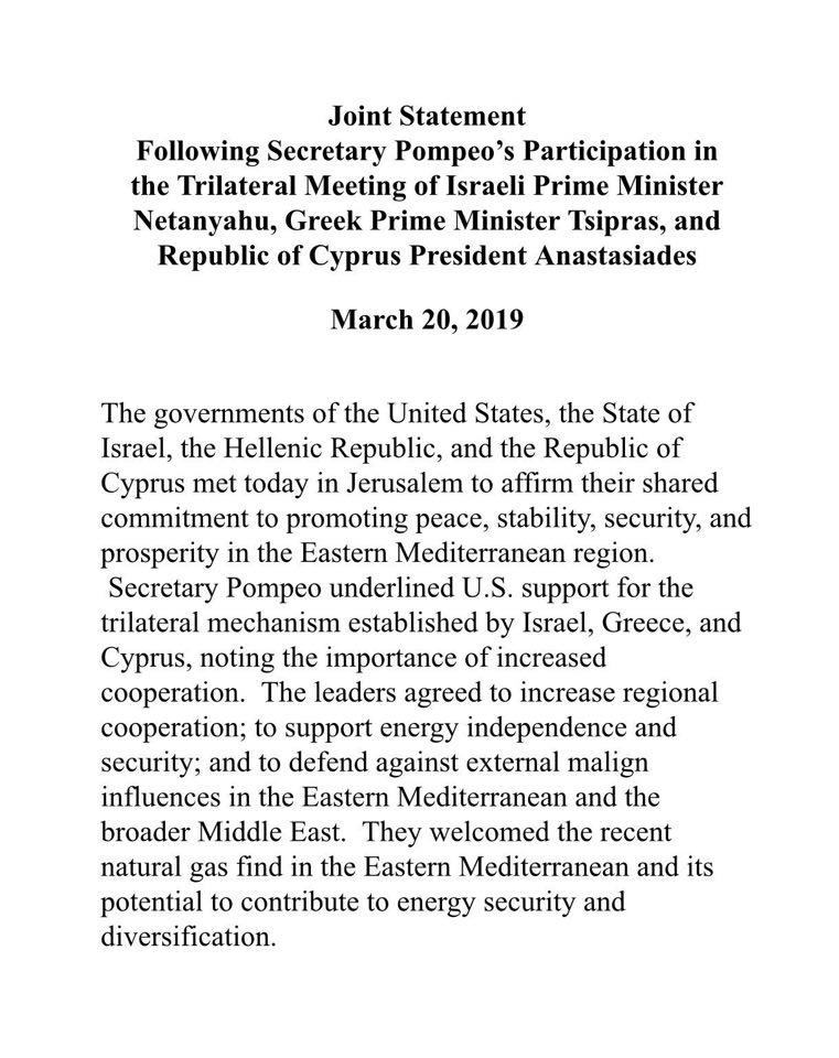 «Οι Κυβερνήσεις των Ηνωμένων Πολιτειών, το Κράτος του Ισραήλ, η Ελληνική Δημοκρατία και η Κυπριακή Δημοκρατία συναντήθηκαν σήμερα στην Ιερουσαλήμ για να επαναβεβαιώσουν την κοινή δέσμευση τους στην προώθηση της ειρήνης, της σταθερότητας, της ασφάλειας και της ευημερίας στην περιοχή της Ανατολικής Μεσογείου.