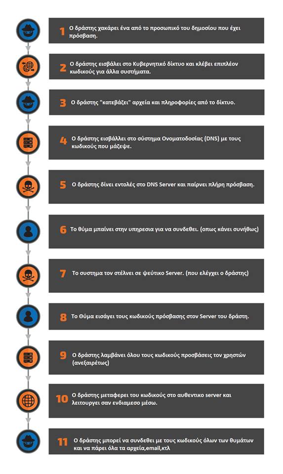 Ο κ. Παστός δημοσίευσε και πίνακα με τα βήματα που χρησιμοποιήθηκαν ώστε οι χάκερς να καταφέρουν πρόσβαση στο σύστημα.
