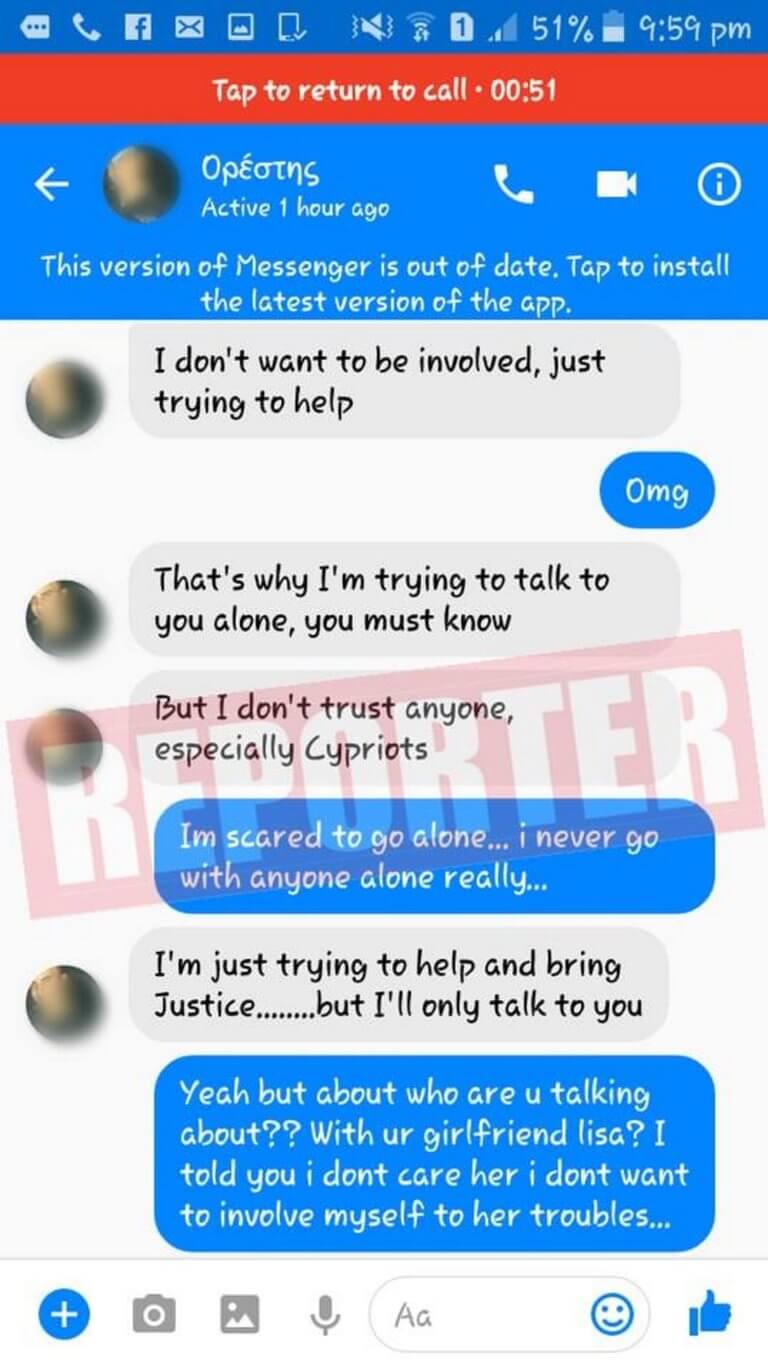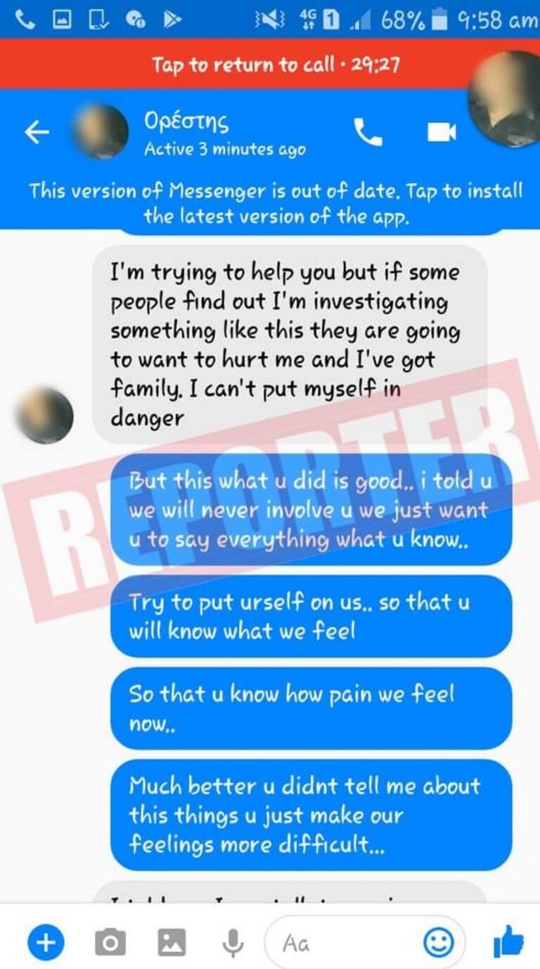 Ο «Ορέστης» ισχυρίστηκε ακόμα ότι προσπαθεί να βοηθήσει αλλά «αν κάποιοι άνθρωποι μάθουν ότι διερευνώ κάτι σαν κι αυτό, θα θέλουν να μου κάνουν κακό και εγώ έχω οικογένεια. Δεν μπορώ να θέσω τον εαυτό μου σε κίνδυνο». «Είναι πολύ σημαντικό, επειδή έκανα έρευνα και βρήκα κάτι, όμως δεν μπορώ να το πω από μήνυμα ή από το τηλέφωνο», υποστήριξε ακόμη.