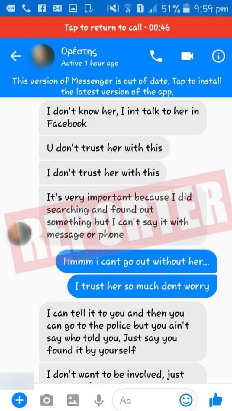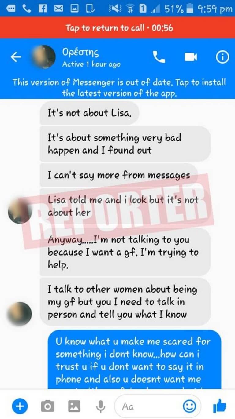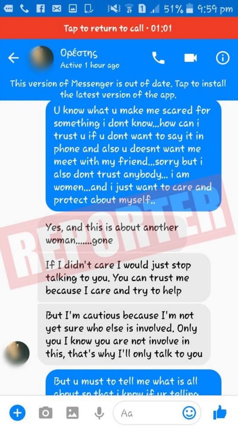 Σύμφωνα με τις συνομιλίες, τις οποίες έχει εξασφαλίσει ο REPORTER, ο «Ορέστης» ανέφερε στη γυναίκα ότι θέλει να της πει κάτι «κακό» που ανακάλυψε αλλά ήταν «επικίνδυνο» και έπρεπε να της μιλήσει από κοντά και όχι από το τηλέφωνο, γιατί ήθελε να βλέπει με ποιον μιλά. «Πρόκειται για μια άλλη γυναίκα… χαμένη».
