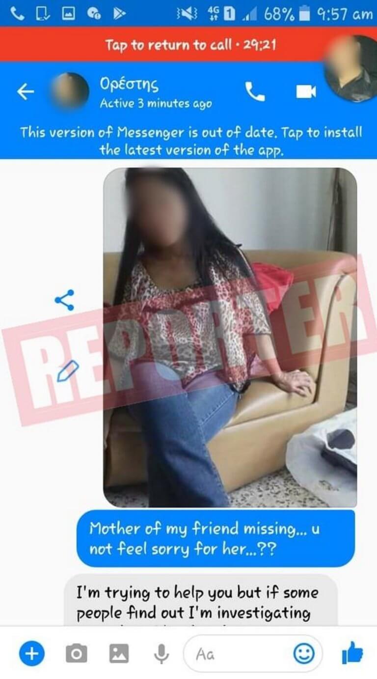 Την ίδια ώρα, νέες αποκαλύψεις έρχονται στο «φως». Μήνυμα σε αλλοδαπή φίλη ελλείπουσας γυναίκας έστειλε ο «Ορέστης» στο Facebook πριν από λίγο καιρό, αναφέροντάς της ότι έχει πληροφορίες για τη φίλη της. Το προφίλ αυτό φέρεται να ανήκει σε άνδρα ο οποίος έχει απασχολήσει τις κυπριακές Αρχές για την υπόθεση, αλλά δεν είναι ο άνδρας που έχει ομολογήσει το διπλό έγκλημα και υποστηρίζει εξαρχής πως χρησιμοποιήθηκε η φωτογραφία του, χωρίς να έχει καμία εμπλοκή.