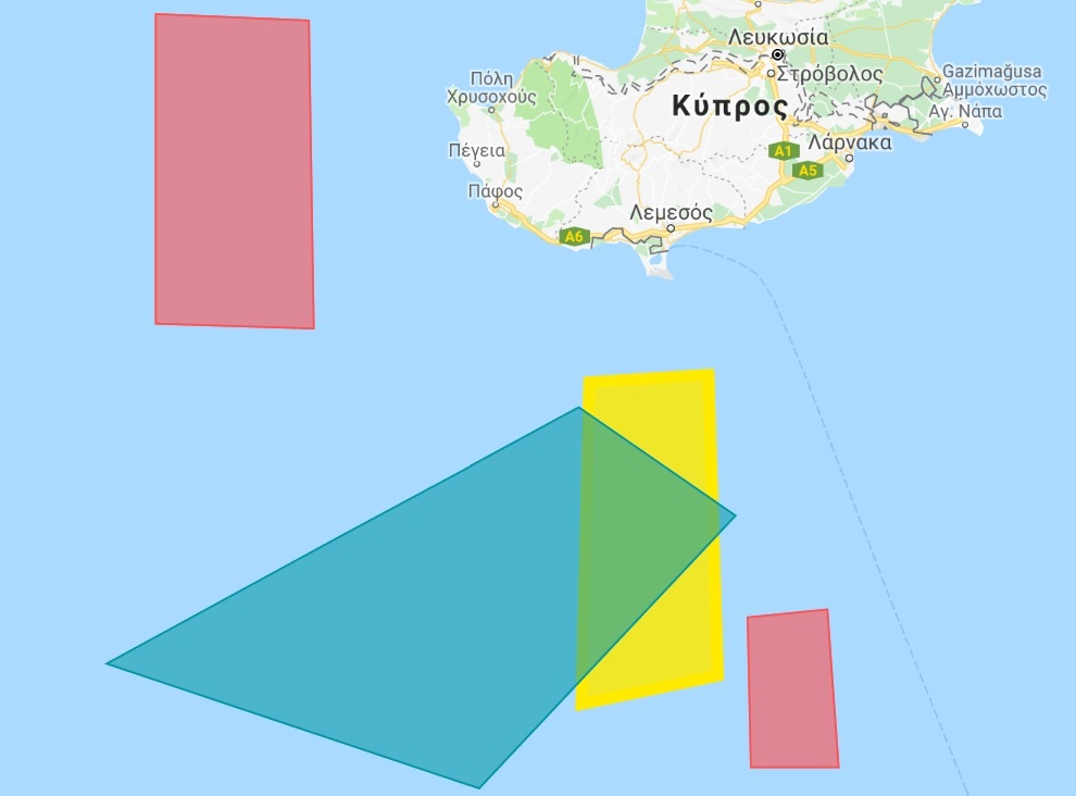 (Mε πράσινο η περιοχή που έχει δεσμεύσει η Κυπριακή Δημοκρατία, με κίτρινο οι περιοχές ερευνών του Barbaros και με κόκκινο οι δύο παράνομα δεσμευμένες για τουρκικές ασκήσεις περιοχές)