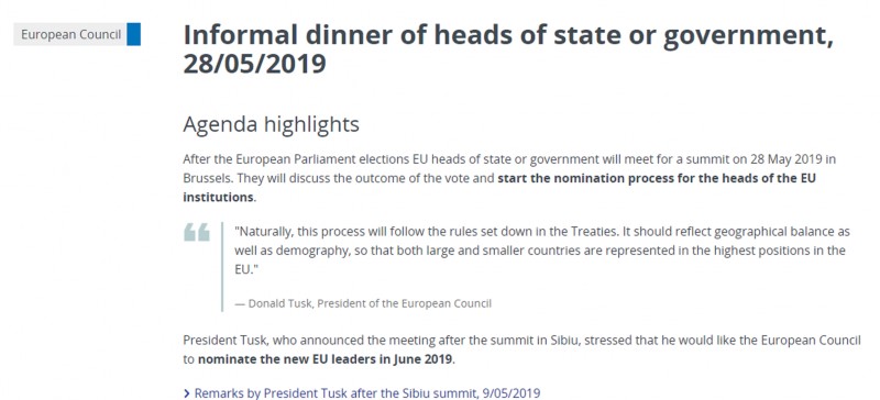 Σύμφωνα με τα όσα αναφέρονται μέχρι στιγμής, στην ατζέντα της 28ης Μαΐου, οι αρχηγοί των κυβερνήσεων της Ε.Ε θα συζητήσουν τα αποτελέσματα των ευρωεκλογών και θα ξεκινήσουν τη διαδικασία υποβολής υποψηφιοτήτων για τους επικεφαλής των θεσμικών οργάνων της Ε.Ε.