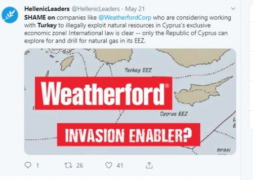 Στο στόχαστρο διαδικτυακών επικρίσεων βρέθηκε η εταιρεία υποστήριξης γεωτρήσεων Weatherford, που φαίνεται να σκέφτεται να βοηθήσει την Τουρκία μέσω της TPAO να διενεργήσει γεωτρήσεις εντός της Κυπριακής ΑΟΖ με τον Πορθητή. Η συγκεκριμένη εταιρεία είχε συνεργαστεί με την ΤΡΑΟ και κατά το παρελθόν για γεωτρήσεις στη Μαύρη Θάλασσα.