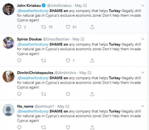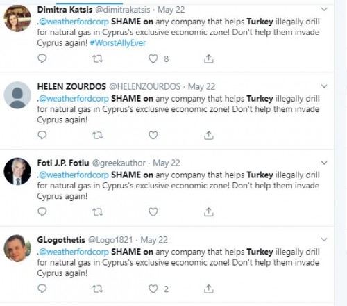 Συγκεκριμένα, πολλοί χρήστες του twitter γράφουν «Ντροπή για κάθε εταιρεία που βοηθά την Τουρκία να τρυπάει παράνομα για φυσικό αέριο στην αποκλειστική οικονομική ζώνη της Κύπρου! Μην τους βοηθήσετε να εισβάλουν ξανά στην Κύπρο!».
