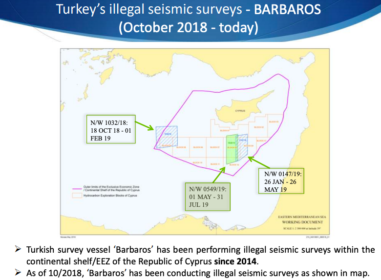 Επιπλέον παρουσιάστηκε σχετικός χάρτης που εμφανίζεται όλες τις σεισμικές έρευνες που πραγματοποίησε το τουρκικό ερευνητικό σκάφος Barbaros εντός της κυπριακής ΑΟΖ μέχρι σήμερα.