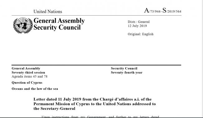 «Επιστολή της 11ης Ιουλίου 2019 από την επιτετραμμένη της Μόνιμης Αντιπροσωπείας της Κύπρου στα Ηνωμένα Έθνη, απευθυνόμενη στον Γενικό Γραμματέα,