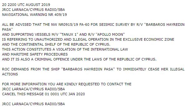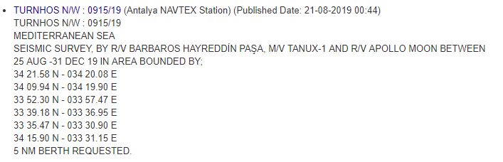 Σύμφωνα με την παράνομη Navtex, το σεισμογραφικό σκάφος θα παραμείνει σε κυπριακά νερά από τις 25 Αυγούστου 2019 μέχρι τις 31 Δεκεμβρίου 2019, συνοδευόμενο από τα υποστηρικτικά πλοία M/V TANUX-1 και R/V APOLLO MOON.