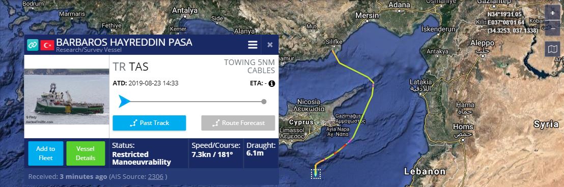 Όπως φαίνεται στον σχετικό χάρτη από την ιστοσελίδα παρατήρησης της ναυσιπλοίας Marine Traffic το τουρκικό σκάφος πλέει νότια, στη θαλάσσια περιοχή μεταξύ Λάρνακας και Λεμεσού και έχει δηλώσει ότι ποντίζει καλώδια σε απόσταση πέντε ναυτικών μιλίων.