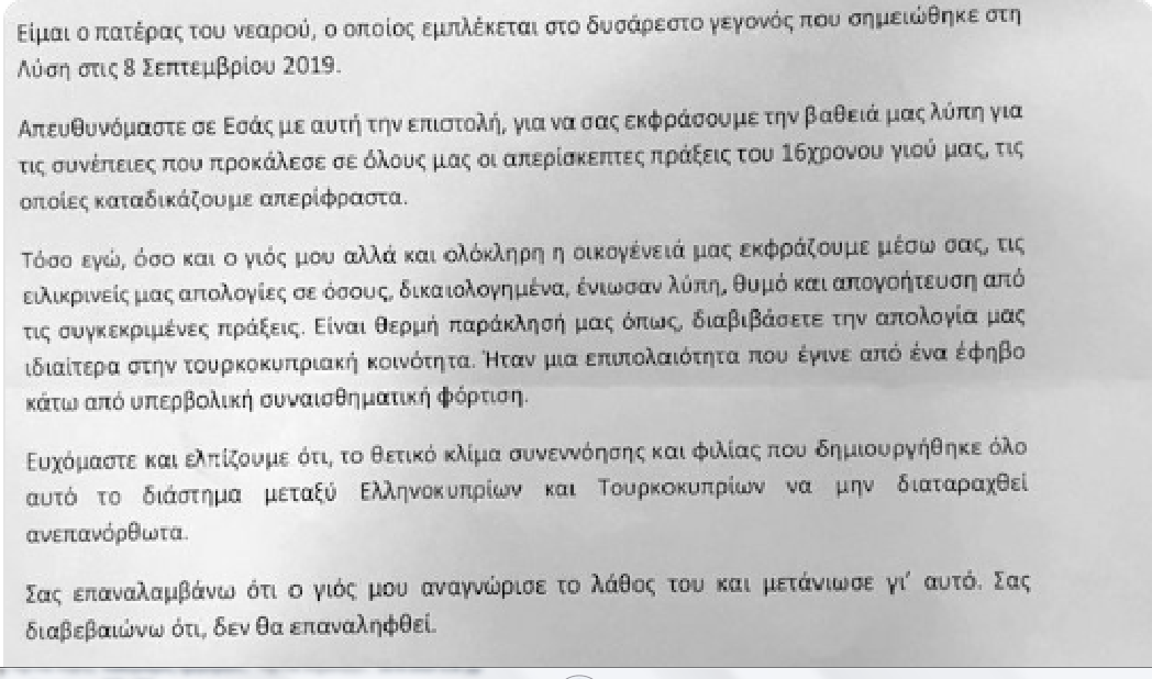 «Είμαι ο πατέρας του νεαρού , ο οποίος εμπλέκεται στο δυσάρεστο γεγονός που σημειώθηκε στη Λύση στις 8 Σεπτεμβρίου 2019. Απευθυνόμαστε σε Εσάς με αυτή την επιστολή, για να σας εκφράσουμε τη βαθειά μας λύπη για τις συνέπειες που προκάλεσε σε όλους μας οι απερίσκεπτες πράξεις του 16χρονου γιού μας, τις οποίες καταδικάζουμε απερίφραστα.