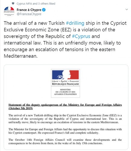 Ο Γάλλος Υπουργός συνομίλησε με τον Κύπριο ΥΠΕΞ, Νίκο Χριστοδουλίδη, για το ζήτημα και εξέφρασε την πλήρη αλληλεγγύη της Γαλλίας, όπως αναφέρεται στη γραπτή του δήλωση.