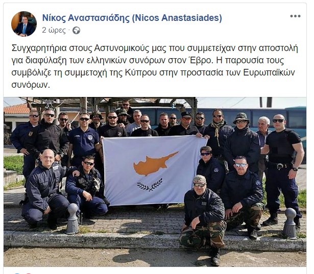 «Συγχαρητήρια στους Αστυνομικούς μας που συμμετείχαν στην αποστολή για διαφύλαξη των ελληνικών συνόρων στον Έβρο. H παρουσία τους συμβόλιζε τη συμμετοχή της Κύπρου στην προστασία των Ευρωπαϊκών συνόρων» σχολίασε συγκεκριμένα ο κ. Αναστασιάδης αναρτώντας και φωτογραφία της κυπριακής αποστολής.