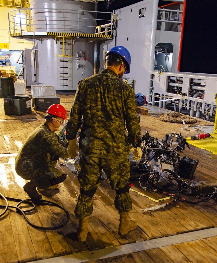 Στα συντρίμμια εντοπίστηκαν και πέντε από τις έξι σορούς του πληρώματος που δεν είχαν εντοπιστεί μετά το δυστύχημα, αφού στις έρευνες που προηγήθηκαν είχε εντοπιστεί στη θάλασσα μόνο μία σορός.
