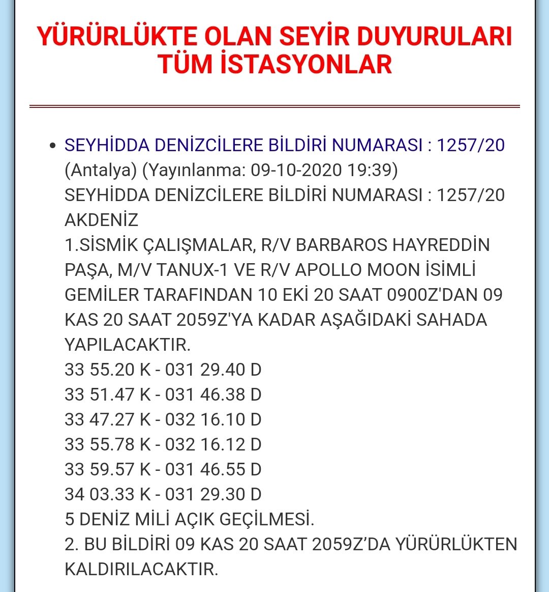 Η νέα NAVTEX αφορά σεισμικές έρευνες από τις 10 Οκτωβρίου μέχρι και τις 9 Νοεμβρίου και συγκεκριμένα στα οικόπεδα 6 και 7, στη θέση που βρίσκονταν πριν το γεωτρύπανο Γιαβούζ αλλά αποσύρθηκε σε λιμάνι της Τουρκίας.