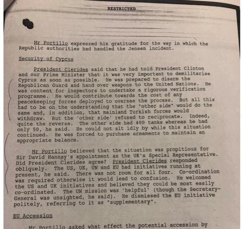 Ο Υπ. Εξωτερικών και Κοινοπολιτείας ήταν ικανοποιημένος που αμφότερες οι πλευρές δεχόντουσαν ως στόχο τους την δι-κοινοτική, δι-ζωνική ομοσπονδία. Ο λόρδος Hannay, ο οποίος παρευρέθηκε, τόνισε ότι στόχος έπρεπε να είναι μια συνολική λύση… και θα βοηθούσε αν οι Τουρκοκύπριοι έπαιρναν όσο το δυνατό περισσότερα ωφελήματα από την ΕΕ. Ο Κληρίδης συμφωνούσε αλλά δεν ήθελε να δοθεί η εντύπωση στους Τουρκοκύπριους ότι θα συμμετείχαν και στην διαπραγμάτευση για ένταξη (αυτό απαιτούσαν οι Τούρκοι). Ο ΥΠΕΞ συμφώνησε μαζί του. Λέχθηκε ότι ο Ντενκτάς μπορούσε να δεχθεί μια διεθνή δύναμη νοουμένου θα περιλάμβανε και Τούρκους και θα διατηρείτο το μονομερή δικαίωμα επέμβασης. Ο Κληρίδης είπε του ήταν δύσκολο να το δεχθεί. Ο ΥΠΕΞ συνέχισε την συζήτησή του με τον Κληρίδη σε γεύμα προς τιμή του…