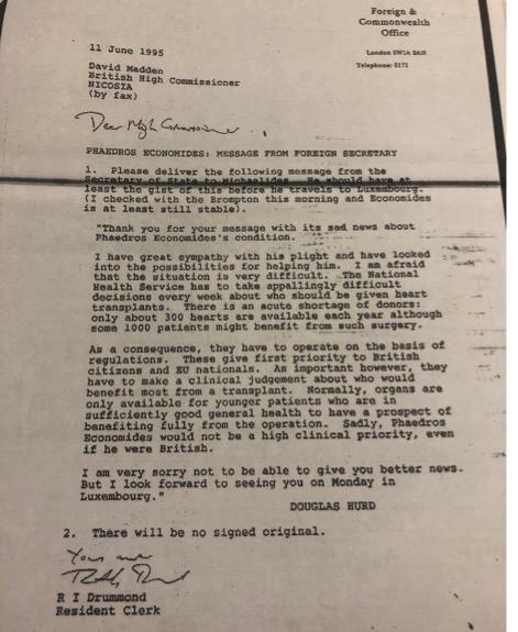 Η αρνητική απάντηση για μεταμόσχευση καρδιάς στον μ. Φ. Οικονομίδη από τον ΥΠΕΞ Douglas Hurd προς τον Κύπριο ομόλογό του (Μιχαηλίδη) μέσω Βρετ. Υπ. Αρμοστού στην Λευκωσία David Madden