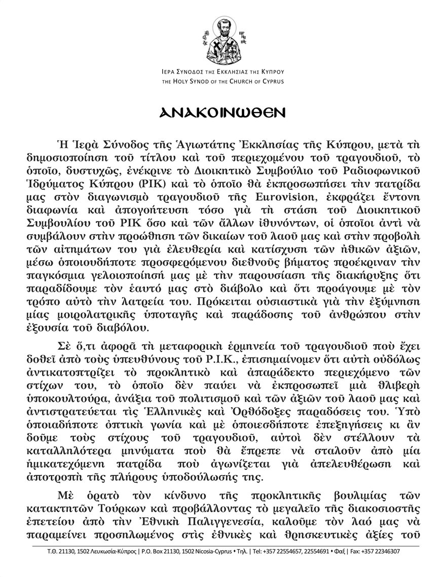 Ένταση επικρατεί στην Κύπρο, με την Ιερά Σύνοδο της Εκκλησίας να καλεί την Κυβέρνηση να μεριμνήσει για την ακύρωση της επιλογής του τραγουδιού «El Diablo» που ενέκρινε το Διοικητικό Συμβούλιο του Ραδιοφωνικού Ιδρύματος Κύπρου (ΡΙΚ), προκειμένου να εκπροσωπήσει τη χώρα στη Eurovision.