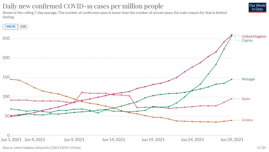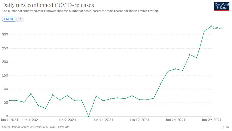 Τα διαγράμματα του Owid «μιλούν από μόνα τους», καθώς τα κρούσματα στο νησί υπερπενταπλασιάστηκαν σε λιγότερο από μία εβδομάδα, από το επίπεδο των 60 ημερησίως, σε πάνω από 300.