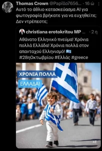 Η κ. Ερωτοκρίτου, βουλεύτρια Λευκωσίας του ΔηΚο, στέλνει για την εθνική επέτειο μια εικόνα φτιαγμένη από τεχνητή νοημοσύνη, με ένα ψευτοπαιδάκι με παραμορφωμένα δάχτυλα και πρόσωπο. https://t.co/kbWf9za05O