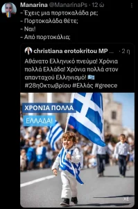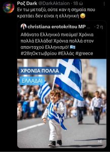 Ανεπιτυχής φάνηκε πως ήταν η επιλογή της βουλευτή Χριστιάνας Ερωτοκρίτου, από την Κύπρο, η οποία έκανε μία αμφιλεγόμενη ανάρτηση για να ευχηθεί «χρόνια πολλά» για την επέτειο της 28ης Οκτωβρίου.