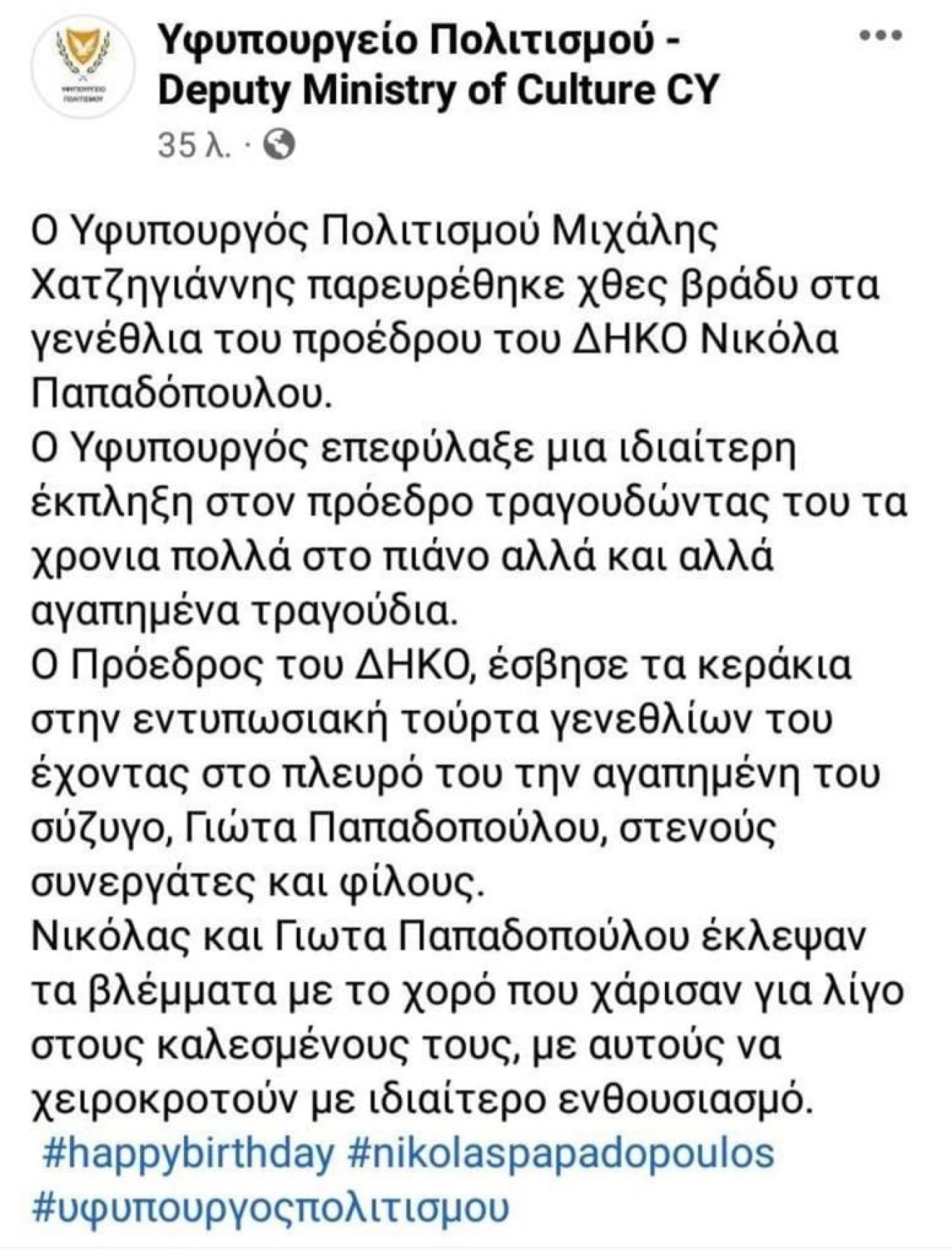Έτσι, το κοινό ενημερώθηκε με τον πλέον επίσημο τρόπο για την παρουσία του Μιχάλη Χατζηγιάννη, την «ιδιαίτερη έκπληξη» που επιφύλαξε στον Νικόλα Παπαδόπουλο «τραγουδώντας του τα χρόνια πολλά στο πιάνο και άλλα αγαπημένα τραγούδια», για την «εντυπωσιακή τούρτα γενεθλίων αλλά και για το γεγονός ότι ο πρόεδρος του ΔΗΚΟ και η σύζυγός του « έκλεψαν τα βλέμματα με το χορό που χάρισαν για λίγο στους καλεσμένους τους, με αυτούς να χειροκροτούν με ιδιαίτερο ενθουσιασμό». Για του λόγου το αληθές, αναρτήθηκε και σχετικό βίντεο.