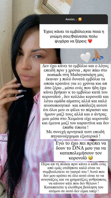 Η Δήμητρα Αλεξανδράκη απαντώντας σε «ακόλουθο» της στο instagram έκανε γνωστούς τους λόγους για τους οποίους δεν θέλει να κάνει το εμβόλιο. Ένας από αυτούς είναι γιατί είχε κάνει τρία ισχυρά εμβόλια όταν συμμετείχε στο reality Nomads, ενώ αποκάλυψε ότι όλοι οι φίλοι της και ο άντρας της κόλλησαν κορωνοϊό, ενώ εκείνη που ήταν συνεχώς μαζί τους όχι.