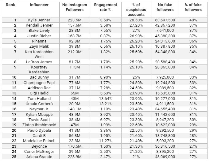 Έτσι από τη μελέτη διαπιστώθηκε ότι η Kylie Jenner έχει τους περισσότερους ψεύτικους ακόλουθους στα μέσα κοινωνικής δικτύωσης. Από τα 223 εκατομμύρια άτομα που την ακολουθούν, κάτι παραπάνω από τα 63 εκατομμύρια είναι ψεύτικοι λογαριασμοί. Νούμερο που ισούται σχεδόν με τον πληθυσμό της Γαλλίας.