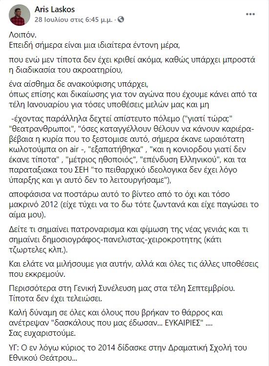 Λίγο μετά την γνωστοποίηση της προφυλάκισης του Πέτρου Φιλιππίδη, ο ηθοποιός Άρης Λάσκος επανέφερε το περιστατικό στην επικαιρότητα με την παρακάτω ανάρτησή του.