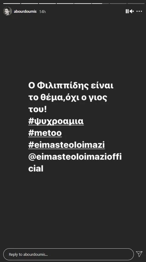 Πάνω σε αυτό θέλησε να τοποθετηθεί ο Αλέξανδρος Μπουρδούμης, με ένα insta story του με το οποίο επισήμανε πως το θέμα είναι ο Πέτρος Φιλιππίδης και όχι ο γιος του. «Το θέμα είναι ο Φιλιππίδης και όχι ο γιος του, ψυχραιμία», έγραψε ο Αλέξανδρος Μπουρδούμης.