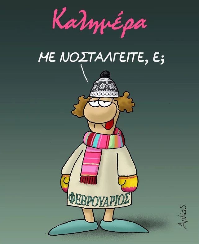 Μάλιστα, τον ισχυρό καύσωνα σχολίασε και με ένα σκίτσο του στο Facebook ο Αρκάς, αναφερόμενος στον Φεβρουάριο. «Με νοσταλγείτε, ε;», είναι το μήνυμα στην εικόνα με τον «Φλεβάρη» να είναι ντυμένος με σκουφάκι, κασκόλ και γάντια.