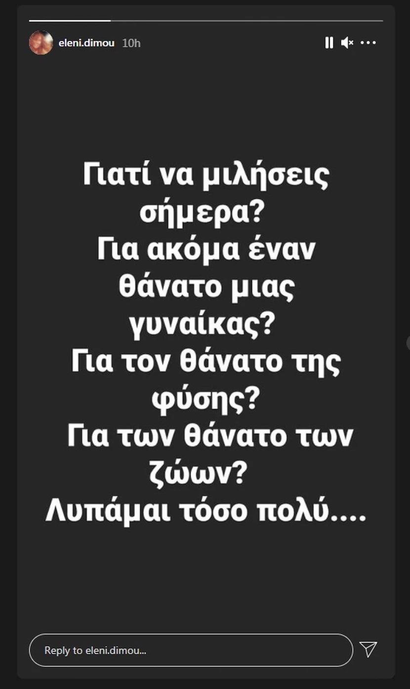 Η τραγουδίστρια έγραψε: «Γιατί να μιλήσεις σήμερα; Για έναν ακόμα θάνατο μιας γυναίκας; Για τον θάνατο της φύσης; Για τον θάνατο των ζώων; Λυπάμαι τόσο πολύ…».