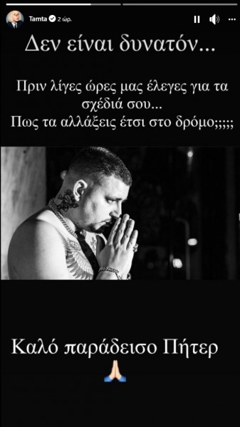 «Δεν είναι δυνατόν.. Πριν λίγες ώρες μας έλεγες για τα σχέδια σου… Πώς τα άλλαξες έτσι στο δρόμο;;; Καλό παράδεισο Πήτερ» έγραψε χαρακτηριστικά η Τάμτα στα social media
