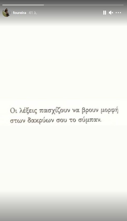 Η Ελένη Φουρέιρα την ημέρα της τραγικής κατάληξης του Mad Clip προτίμησε να ανεβάσει μια μαύρη φωτογραφία στα social media, ωστόσο την Παρασκευή ανάρτησε στα stories της έναν στίχο του Κωνσταντίνου Ι. Κορίδη από το ποίημα του «Δημιουργία».