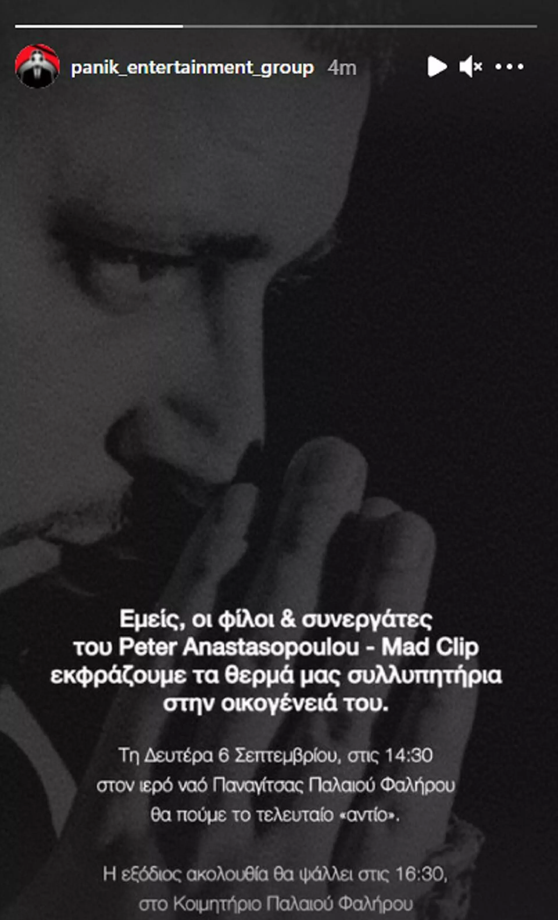 Ειδικότερα, η δισκογραφική εταιρεία Panik Records, που εκπροσωπούσε τον 34χρονο Πίτερ Αναστασόπουλου, ανακοίνωσε ότι τη Δευτέρα 6 Σεπτεμβρίου στις 14:30 θα λάβει χώρα το τελευταίο «αντίο» στον ιερό ναό της Παναγίτσας στο Παλαιό Φάληρο.