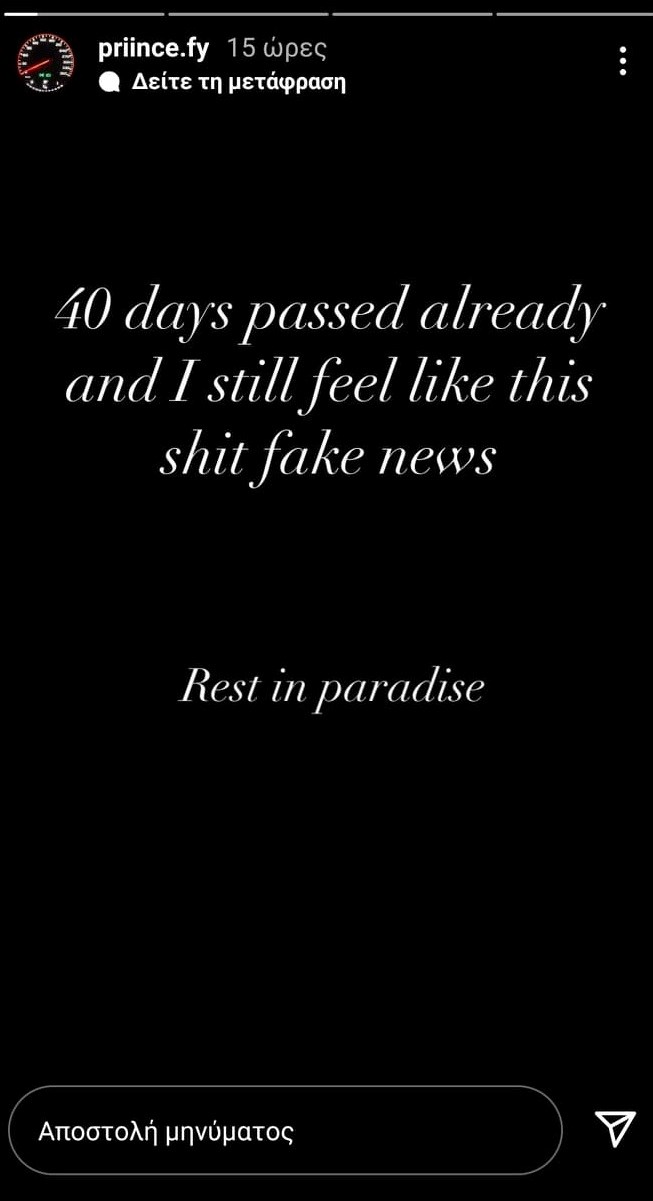 «40 ημέρες πέρασαν κιόλας και ακόμη αισθάνομαι ότι είναι fake news. Αναπαύσου στον παράδεισο» έγραψε ο FY.