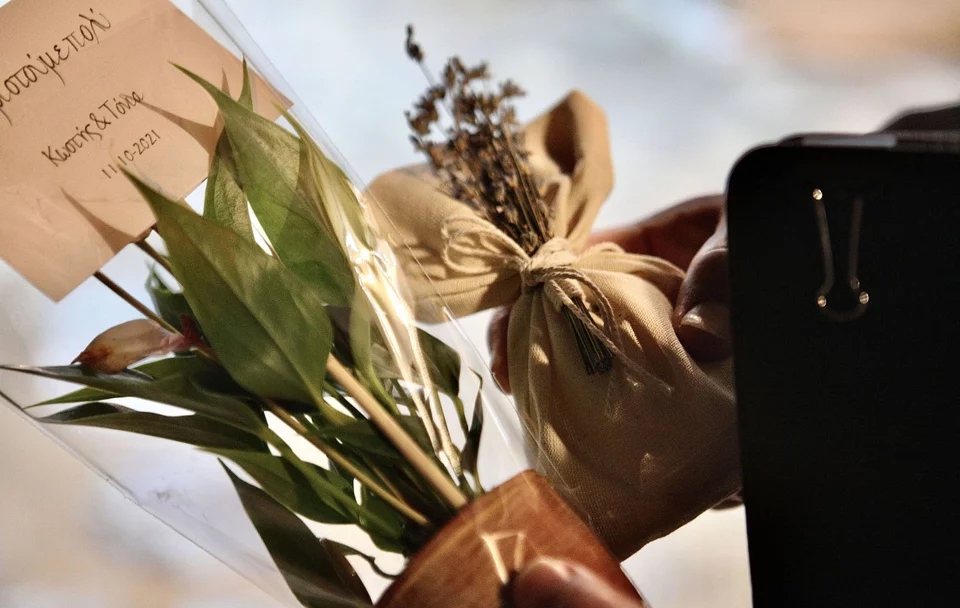 Το ζευγάρι επέλεξε μια μπομπονιέρα-πουγκί, η οποία συνοδευόταν με ένα γλαστράκι: «Ευχαριστούμε πολύ, Κωστής & Τόνια, 11-10-2021», έγραφε.