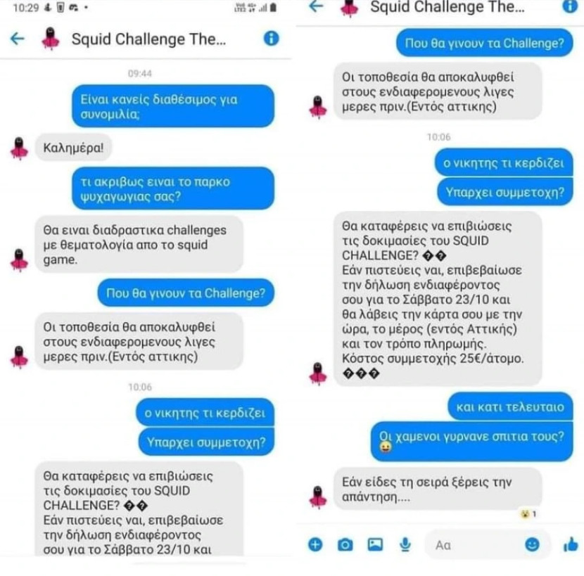 Όπως βλέπουμε στον διάλογο που δημοσιοποίησε ένας χρήστης, η ομάδα του «αθηναϊκού Squid Game», του υπογράμμισε πως «θα λάβει την κάρτα του με την ώρα και το μέρος, αλλά και τον τρόπο πληρωμής», όπως ακριβώς είδε στη σειρά.