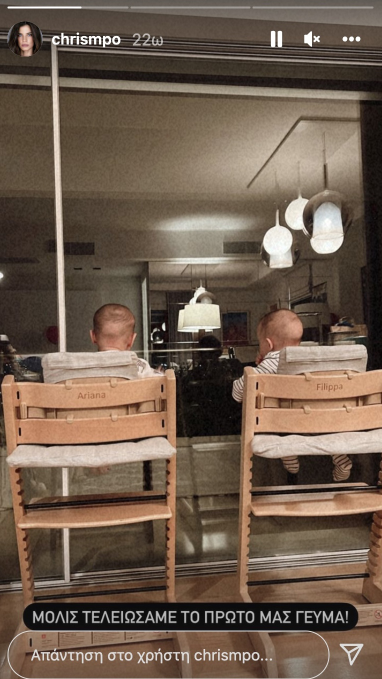 Από τον χώρο που μένουν τώρα λοιπόν, η 33χρονη Influencer ανέβασε ένα στιγμιότυπο στα stories της το απόγευμα της Τρίτης (23/11). Στο εν λόγω πλάνο βλέπουμε τις δίδυμες κόρες της να τρώνε το πρώτο τους γεύμα εκεί, καθιστές μάλιστα σε δύο ξύλινες καρέκλες, αποκλειστικά φτιαγμένες για εκείνες. Η μία αναγράφει Ariana και η άλλη Filippa, τα ονόματα που έχουν αποκαλύψει ότι θα τους δώσουν το καλοκαίρι που θα τις βαφτίσουν.