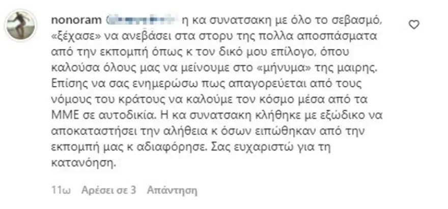 Συγκεκριμένα, έγραψε: «H κα Συνατσακη με όλο το σεβασμό, “ξέχασε” να ανεβάσει στα στόρι της πολλά αποσπάσματα από την εκπομπή όπως και τον δικό μου επίλογο, όπου καλούσα όλους μας να μείνουμε στο “μήνυμα” της Μαίρης. Επίσης, να σας ενημερώσω πως απαγορεύεται από τους νόμους του κράτους να καλούμε τον κόσμο μέσα από τα ΜΜΕ σε αυτοδικία. Η κα Συνατσακη κλήθηκε με εξώδικο να αποκαταστήσει την αλήθεια και όσων ειπώθηκαν από την εκπομπή μας και αδιαφόρησε. Σας ευχαριστώ για τη κατανόηση».