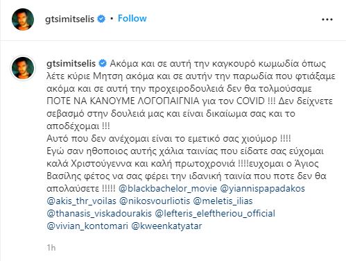 «Ακόμα και σε αυτή την καγκουρό κωμωδία όπως λέτε κύριε Μήτση ακόμα και σε αυτήν την παρωδία που φτιάξαμε ακόμα και σε αυτή την προχειροδουλειά δεν θα τολμούσαμε ΠΟΤΕ ΝΑ ΚΑΝΟΥΜΕ ΛΟΓΟΠΑΙΓΝΙΑ για τον COVID !!! Δεν δείχνετε σεβασμό στην δουλειά μας και είναι δικαίωμα σας και το αποδέχομαι !!! Αυτό που δεν ανέχομαι είναι το εμετικό σας χιούμορ !!!! Εγώ σαν ηθοποιός αυτής χάλια ταινίας που είδατε σας εύχομαι καλά Χριστούγεννα και καλή πρωτοχρονιά !!!!εύχομαι ο Άγιος Βασίλης φέτος να σας φέρει την ιδανική ταινία που ποτέ δεν θα απολαύσετε !!!!!».