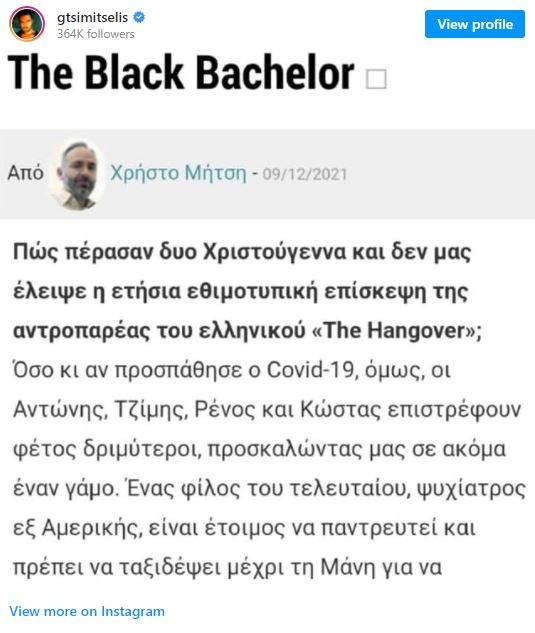 H ταινία «The Black Bachelor» το βράδυ της Τρίτης 7 Δεκεμβρίου έκανε επίσημή πρεμιέρα σε γνωστό εμπορικό κέντρο των βορείων προαστίων με πρωταγωνιστή, τον Γιάννη Τσιμητσέλη. Με αφορμή την ταινία ο κριτικός κινηματογράφου, Χρήστος Μήτσης έγραψε για την νέα ταινία, «The Black Bachelor» την κριτική του.