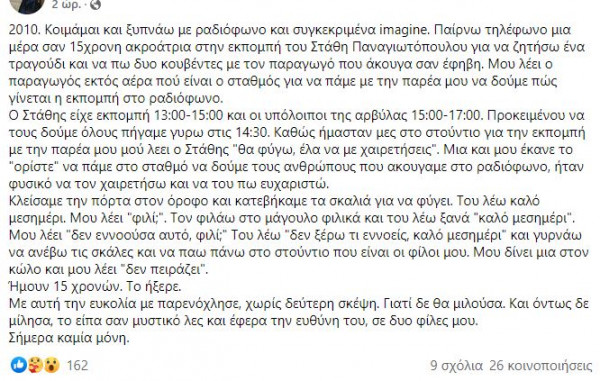 «2010. Κοιμάμαι και ξυπνάω με ραδιόφωνο και συγκεκριμένα imagine. Παίρνω τηλέφωνο μια μέρα σαν 15χρονη ακροάτρια στην εκπομπή του Στάθη Παναγιωτόπουλου για να ζητήσω ένα τραγούδι και να πω δυο κουβέντες με τον παραγωγό που άκουγα σαν έφηβη. Μου λέει ο παραγωγός εκτός αέρα πού είναι ο σταθμός για να πάμε με την παρέα μου να δούμε πώς γίνεται η εκπομπή στο ραδιόφωνο.