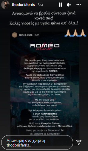 «Ανυπομονώ να βρεθώ σύντομα ξανά κοντά σας! Καλές γιορτές με υγεία πάνω απ’ όλα ..!» έγραψε ο Θοδωρής Φέρρης στο Instagram του μετά την ανακοίνωση του νυχτερινού κέντρου.
