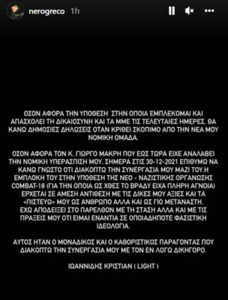 «Όσον αφορά τον κ. Γιώργο Μακρή που έως τώρα είχε αναλάβει την νομική υπεράσπισή μου, σήμερα στις 30-12-2021 επιθυμώ να κάνω γνωστό ότι διακόπτω την συνεργασία μου μαζί του» γράφει.