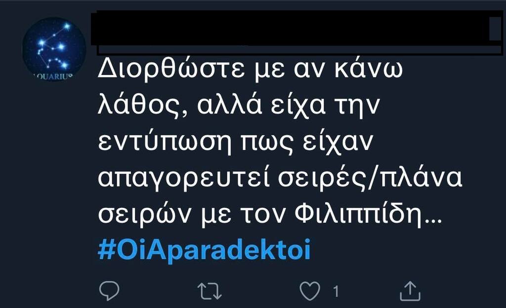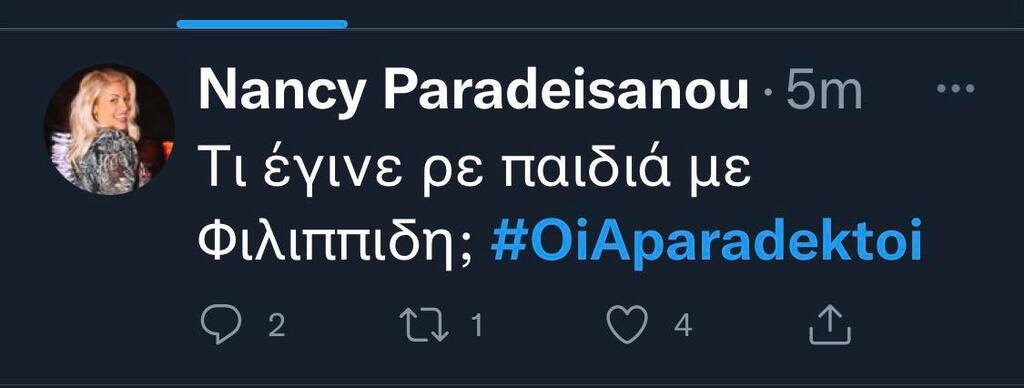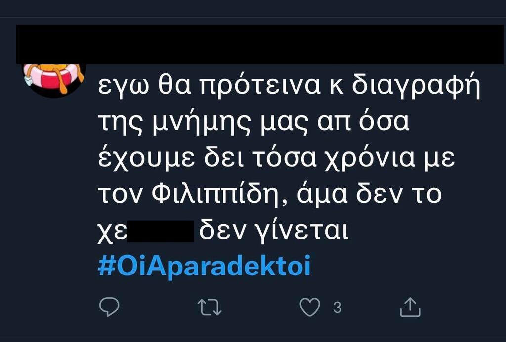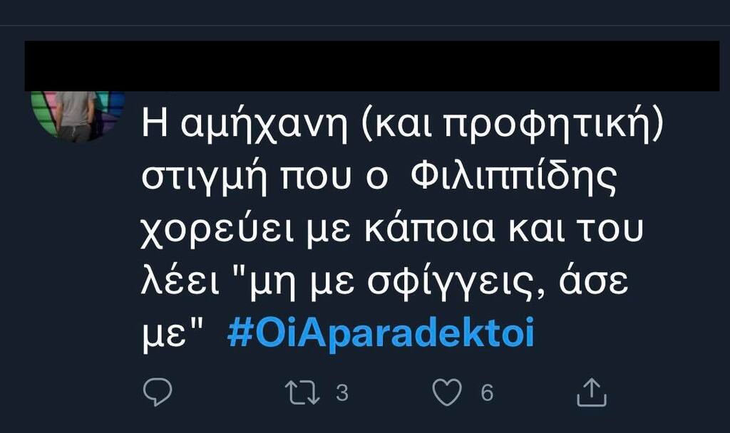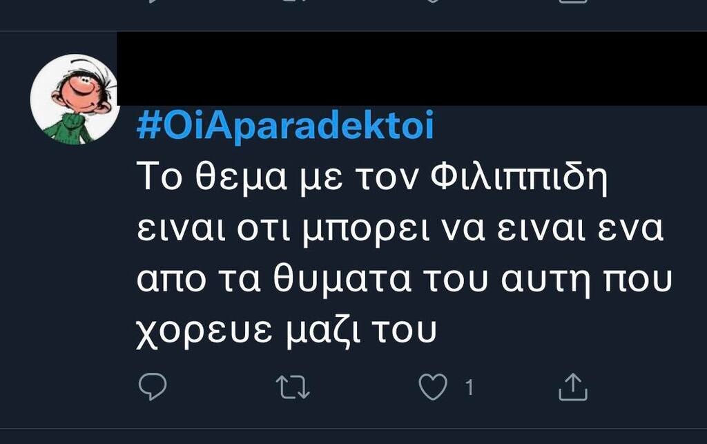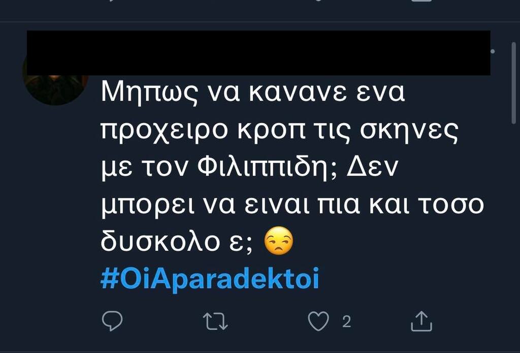 Για κάποιο λόγο όμως, το Mega έκανε προβολή των συγκεκριμένων σκηνών με τον Πέτρο Φιλιππίδη ο οποίος εμφανίζεται να χορεύει σε ένα πάρτι των πρωταγωνιστών των Απαράδεκτων. Κάτι που δεν θα μπορούσε να περάσει απαρατήρητο από τους χρήστες του Twitter που για ακόμα μία φορά διχάστηκαν λόγω των διαφορετικών απόψεών τους.