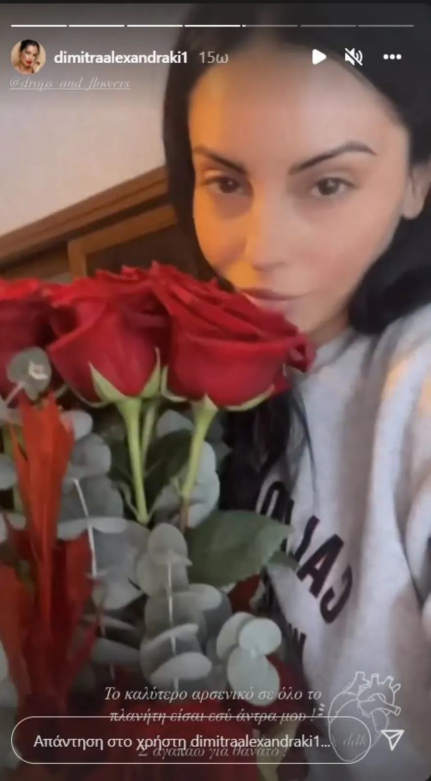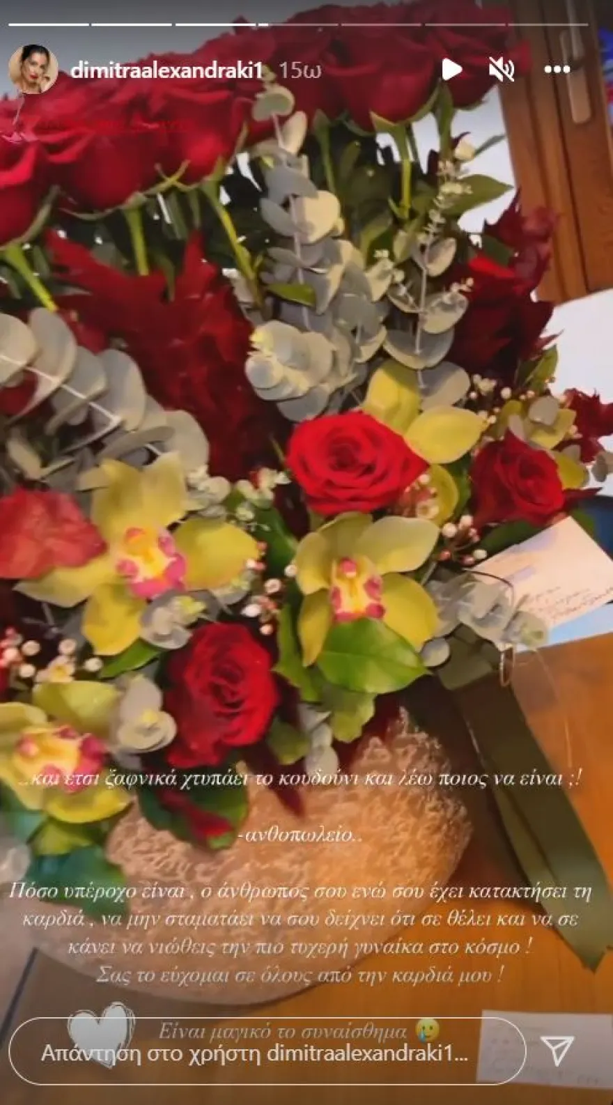 «Έτσι ξαφνικά χτυπάει το κουδούνι και λέω “ποιος είναι;”. Ανθοπωλείο. Πόσο υπέροχο είναι ο άνθρωπός σου, ενώ έχει κατακτήσει την καρδιά σου, να μην σταματάει να σου δείχνει ότι σε θέλει και να σε κάνει να νιώθεις την πιο τυχερή γυναίκα του κόσμου! Το εύχομαι σε όλους από την καρδιά μου! Είναι μαγικό το συναίσθημα» σημειώνει, συγκινημένη, πάνω στο στιγμιότυπο με την ανθοδέσμη.