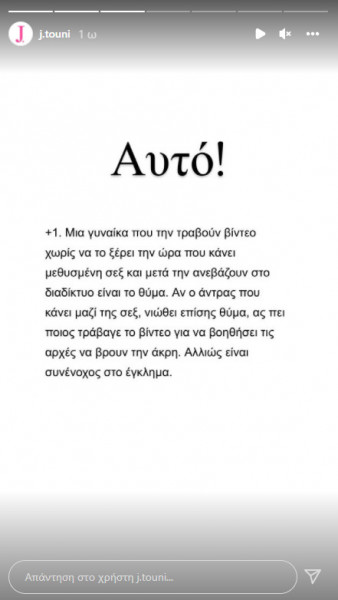 «Μια γυναίκα που την τραβούν βίντεο χωρίς να το ξέρει την ώρα που κάνει μεθυσμένη σεξ και μετά την ανεβάζουν στο διαδίκτυο είναι το θύμα. Αν ο άντρας που κάνει μαζί της σεξ, νιώθει επίσης θύμα, ας πει ποιος τράβαγε το βίντεο για να βοηθήσει τις Αρχές να βρουν την άκρη. Αλλιώς είναι συνένοχος στο έγκλημα», έγραψε στο story της.