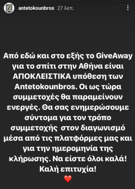 Τα αδέρφια Αντετοκούνμπο κινήθηκαν άμεσα, ανακοινώνοντας πως το «giveaway» σπίτι με θέα την Ακρόπολη, θα γινόταν αποκλειστικά από τον δικό τους λογαριασμό πλέον, ενώ και ο Αλέξανδρος Κοψιάλης με τη σειρά του, δημοσίευσε ένα βίντεο στο οποίο απαντά, για όσα του καταλογίζουν το τελευταίο διάστημα.
