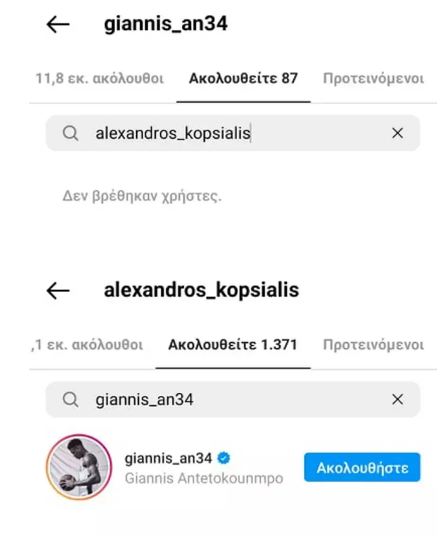 Οι σχέσεις ωστόσο του Αλέξανδρου Κοψιάλη και των αδερφών Αντετοκούνμπο δεν είναι οι καλύτερες αυτή τη στιγμή, αφού ο Γιάννης Αντετοκούνμπο δεν ακολουθεί πλέον τον Αλέξανδρο Κοψιάλη στο Instagram, σε αντίθεση με τον Influencer που συνεχίζει να τον ακολουθεί.