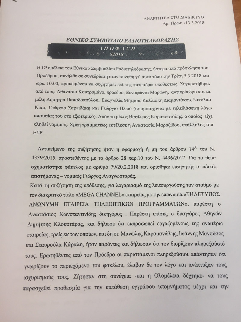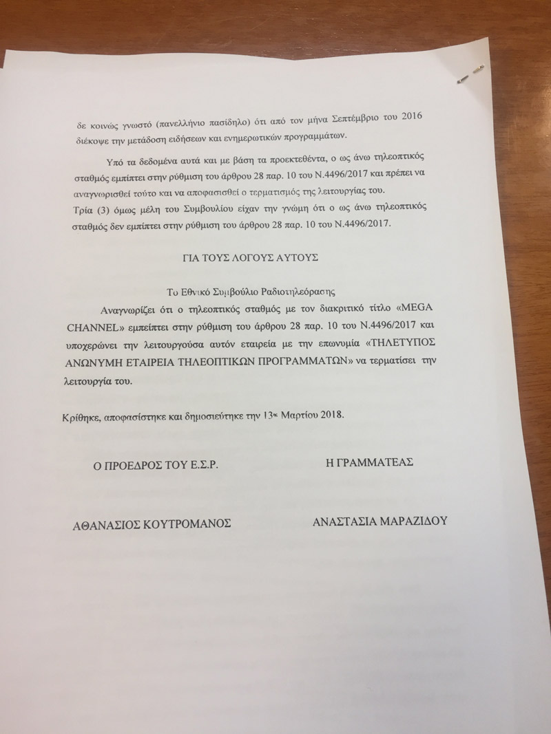 «Το Εθνικό Συμβούλιο Ραδιοτηλεόρασης αναγνωρίζει ότι ο τηλεοπτικός σταθμός με το διακριτικό τίτλο «MEGA CHANNEL» εμπίπτει στη ρύθμιση του άρθρου 28 παρ. 10 του Ν. 4496/2017 και υποχρεώνει τη λειτουργούσα αυτόν εταιρεία με την επωνυμία «ΤΗΛΕΤΥΠΟΣ ΑΝΩΝΥΜΗ ΕΤΑΙΡΕΙΑ ΤΗΛΕΟΠΤΙΚΩΝ ΠΡΟΓΡΑΜΜΑΤΩΝ» να τερματίσει τη λειτουργία του», αναφέρει το διατακτικό της απόφασης.